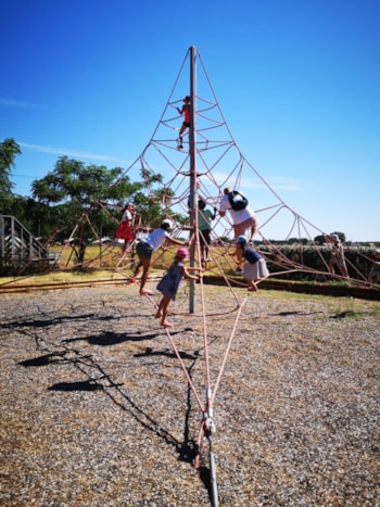 le terrain de sport en plein soleil, nous avons eu de la chance côté météo mais ce qui n'a pas permis aux enfants de profiter de cet espace de jeux (beaucoup trop chaud) - aussi le soir, le terrain sans éclairage dommage car c'était le seul moment de la journée où il était possible de jouer. un côté des sanitaires, ne restait pas propre très longtemps, dommage, mais au bout de quelques jours nous avons opté pour un autre sanitaire et c'était mieux.