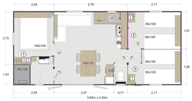 mobil home 3 chambres . 1 salle de bain. cuisine .salon . terrase .