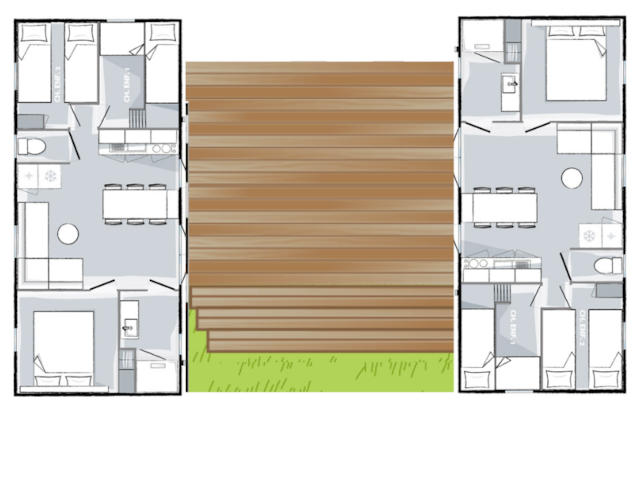 Deux mobil-homes Riviera 3 chambres / 1 salle de bain (33 m² chacun), réunis sur une même parcelle pour créer un ensemble spacieux et convivial, idéal pour les grandes familles ou les séjours entre amis.